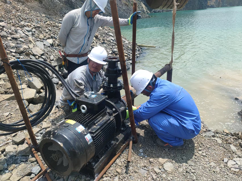 抗旱方案有了,可是要想把水從70米深的礦坑內(nèi)抽到地面,不但需要揚(yáng)程特別高的水泵,還需要高規(guī)格長距離的水管和電纜,還有很多配套零部件要采購。旱情就是命令,抗旱就是責(zé)任,興天礦業(yè)副總經(jīng)理趙崗牽頭落實(shí)抗旱物資采購,親自指揮設(shè)備調(diào)運(yùn)安裝,帶領(lǐng)公司抗旱突擊隊(duì)和社區(qū)干部深入礦坑,一起研究水泵需要多大功率安裝在什么地方、水管需要多粗從哪里下放、電纜需要多長從哪里接電等問題。方案制定好了,老百姓的水稻不能等,挖掘機(jī)第一時間進(jìn)場整理場地,興天礦業(yè)和社區(qū)準(zhǔn)備的水泵、水管電纜等也迅速到位,抗旱突擊隊(duì)與社區(qū)干部群眾一起與時間賽跑,從早到晚緊張施工,一心想著的就是早點(diǎn)把水抽上去,盡量把旱情影響降到最低。
